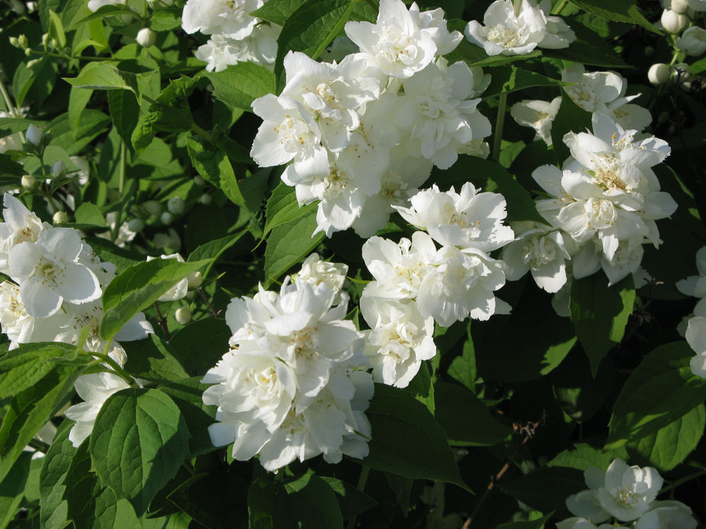Диаметром до 5 см, махровые, собраны в крупные соцветия по 7–9 штук. Лепестки белые, слегка зеленоватые, внутри цветка — несколько вытянутые. Аромат тонкий, не резкий — один из признаков, за который ценят старые сорта чубушника.