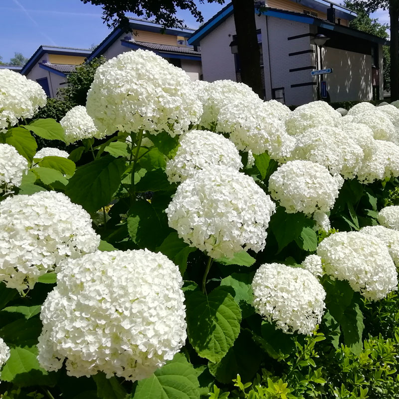 Главное достоинство «Аннабель» — крупные, шаровидные соцветия из стерильных белых цветков. Они появляются на побегах текущего года и цветут с июня по сентябрь. Под тяжестью цветков ветви могут наклоняться, особенно после дождя, но куст при этом не теряет декоративности.